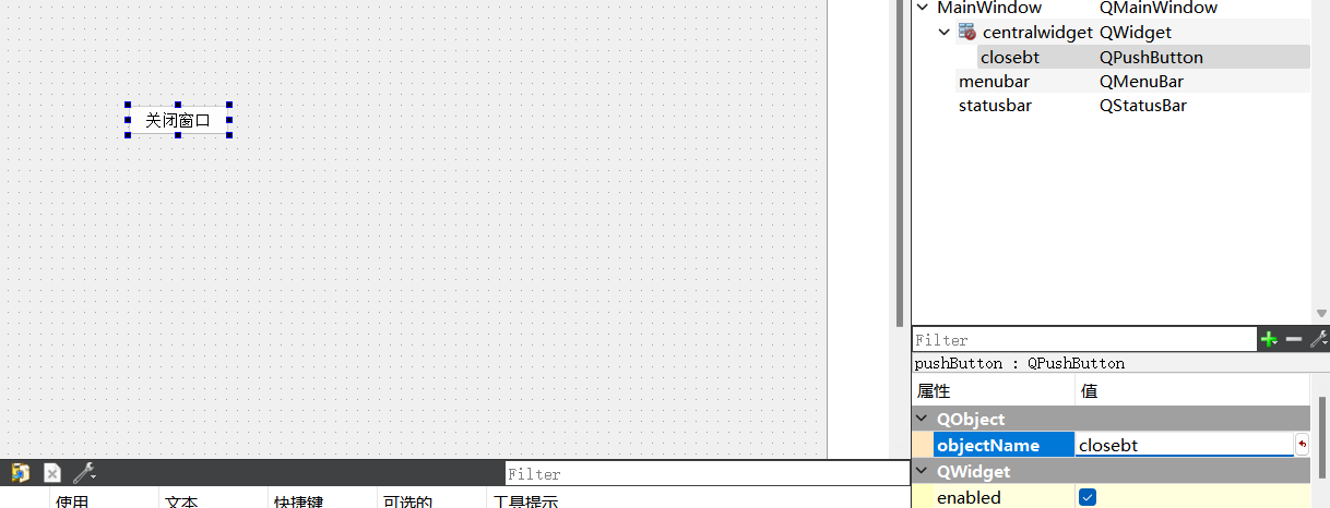 在mainwindow窗口里面做如下操作,对应ui界面的closebt这个按钮,clicked点击发信号,发给this当前窗口对象,当前窗口接收到,做出close这个操作